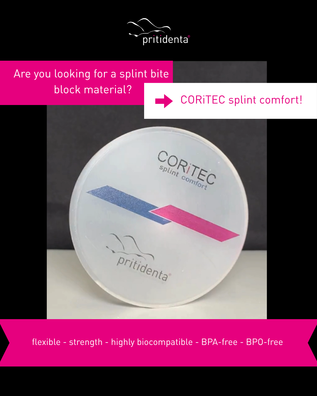 There are many flexible splint materials with thermo memory effect on the dental market. The CORiTEC® splint comfort MSI milling blank with the new MSI® technology is unique. The combination of the thermo memory effect and the patented MSI® (Multi-Species Inhibition) technology makes this BPA-free plastic material a real game changer – for dentists, laboratories and, above all, for patients.