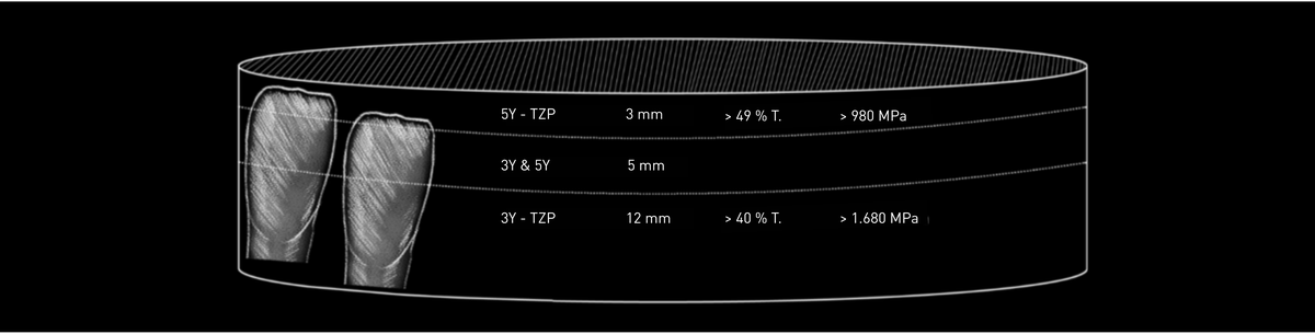 Durch die Kombination aus 3Y (Translucent mit sehr hoher Festigkeit) und 5Y (High Translucent mit sehr hoher Transluzenz) entstehen Verbesserungen bei der ästhetischen Wirkung und Sicherheit für einen uneingeschränkten Indikationsbereich von Restaurationen. Neben einem sanftem Übergang zwischen den Schichten innerhalb der Ronde bzw. Restauration konnten wir zudem durch die untere Schicht eine gute Abdeckung und hohe Stabilität gewähren.