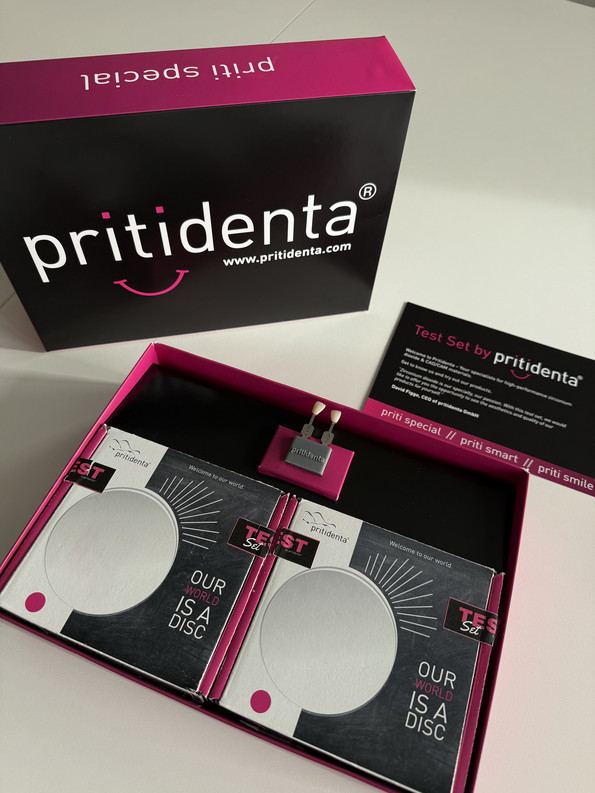 Interessierte Dentallabore und Fräszentren können das priti® Test Set 2.0 ab sofort unter sales@pritidenta.com anfordern und die Materialqualität selbst erleben.
