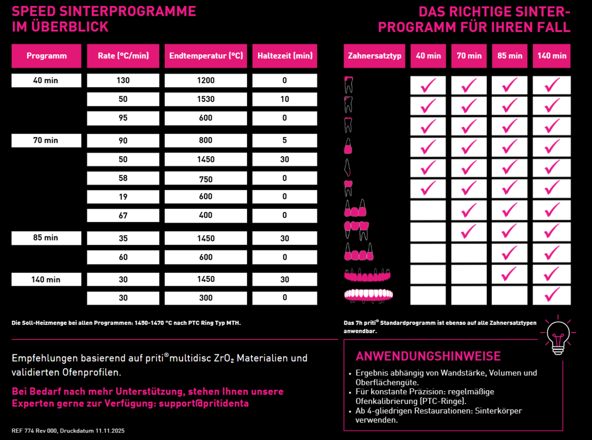 Hinweis: Für exakte Ergebnisse sollte die Sinterung ausschließlich in kalibrierten Öfen durchgeführt werden. Eine finale Temperaturmessung mit PTC-Ringen (MTH) von pritidenta wird empfohlen.