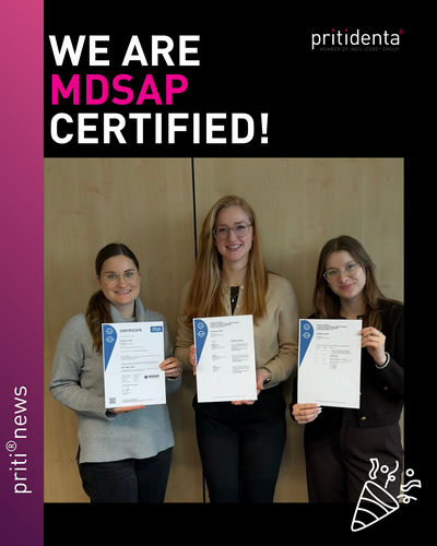 Die neue europäische Medizinprodukte-Verordnung (EU 2017/745), abgekürzt MDR (Medical Device Regulation), ist ein zentrales Thema für Hersteller von Medizinprodukten. Um die Gesetzeskonformität zu gewährleisten, arbeitete pritidenta eng mit der Firma mdc (medical device certification) zusammen. Das Qualitätsmanagementsystem wurde an die erhöhten Anforderungen der MDR angepasst und von mdc erfolgreich