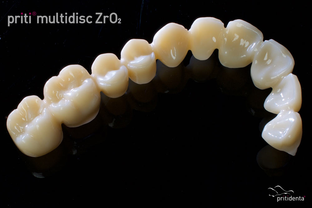 Mit den Materialien priti®multidisc ZrO2 Multi Translucent und Multi Translucent PLUS, priti®multidisc ZrO2 Extra Translucent Multilayer compact sowie priti®multidisc ZrO2 monochrom in den Transluzenzstufen Opaque, Translucent und Extra Translucent können Brücken konstruiert werden. Die Klasse 5 Dentalkeramiken zeichnen sich durch eine Biegefestigkeit von weit über 800 MPa aus. Gemäß DIN EN ISO 6872 sind sie somit für monolithische Brücken und Verblendbrücken mit vier und mehr Gliedern geeignet. Eine Limitierung hinsichtlich Spannweite und Verteilung der Brückenpfeiler gibt es nicht. Grundsätzlich sind jedoch die statischen und physiologischen Belastungsgrenzen zu berücksichtigen.