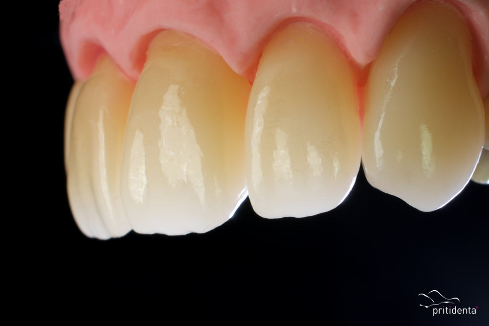 Im Idealfall werden daher monolithische, also vollanatomische ZrO2 Restaurationen poliert und zusätzlich glasiert – insbesondere die Bereiche mit Antagonistenkontakt. Für die Glasur empfehlen wir den Einsatz von priti®perfect glaze.