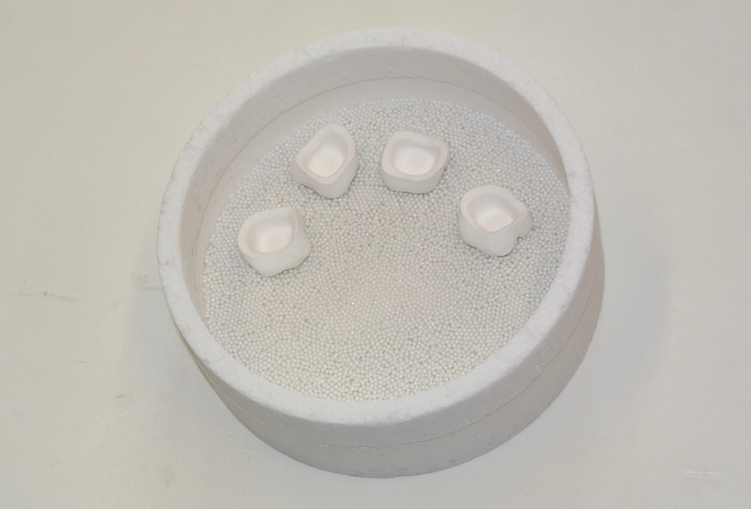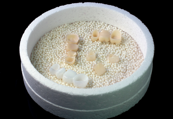 Mit Sinterperlen (zum Beispiel priti®pearl Sinterperlen) werden die vollkeramischen Gerüste sicher und zweckdienlich im Ofen gelagert. Sie sind auf die Sintertemperatur des Ofens bis zu 1600 °C abgestimmt und sorgen für verzugsfreie Sinterergebnisse.